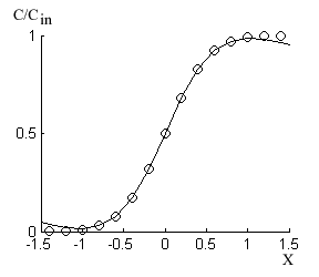 Сделав столь важный вывод, пора подумать о правомерности сделанных ранее допущений *). Иными словами, насколько полученная функция точно описывает фронтальную кривую. Проверить это несложно. Надо сравнить график, полученный решением функции (3) численным способом, и график новой функции. Результаты сравнения показаны на рисунке. В диапазоне x от -1 до 1 погрешность аппроксимации не превышает 0,5 10-2 Сin. Из этого следует, что новая функция удовлетворительно описывает 95% фронтальной кривой по высоте.