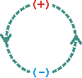 На рисунке условно изображено дискретное поперечное электрическое возмущение (смещение) квантового поля. Знаком (+) обозначена положительная область возмущения, знаком (-) - отрицательная. Между разноименными областями существует электрическое смещение, которое представляет электрический поток величиной в квант количества электричества. Движение (изменение) электрического потока всегда связано с током смещения. Стрелки "/\" и "\/" указывают направление тока электрического смещения квантов поля (квантов заряда). Вначале, образуя возмущение (напряженность), ток электрического смещения поля течет в одну сторону, в конце возмущения - в обратную, т.е. в результате смещения возникает область с избытком в один квант и область с недостатком - дырка, которые, распространяясь как поперечное возмущение, представляют вихревое (нестационарное) электрическое поле. Поперечное возмущение, проходя участки поля в виде расходящихся и затем сходящихся разноименных областей как поперечное противоположное движение зарядов с разными знаками, совершаемое за период в половину длины волны фотона, образует в пространстве движущийся дискретный круговой ток электрического смещения Iсм = 2ev, где e - квант электрического заряда, v - частота электромагнитной волны. Эффективный радиус, по которому течет замкнутый ток смещения: r = l/2p, где l - длина волны фотона. Надо заметить, что отрицательная область возмущения создает обратное направление тока, поэтому ток замкнут по кругу (аналогия с током проводимости, где отрицательно заряженные электроны движутся в одну сторону, но принято считать, что ток течет в обратном направлении). Иногда возмущение удобнее представлять как состоящее из двух разноименных токов смещения - положительного и отрицательного. Движущийся круговой ток смещения для покоящегося наблюдателя является переменным, так как в начале распространяющегося возмущения он течет в одном направлении, в конце - в обратном.