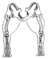 "Коровьи" скакательные суставы. У собаки здорового телосложения, стоящей в естественной позе и рассматриваемой сзади, воображаемая отвесная линия, проведенная от седалищного бугра, пересекала бы бедро и голень, проходила бы через выступ скакательного сустава и затем продолжалась бы вдоль оси плюсны до ступни. Скакательные суставы "ввернутые" внутрь с этой линии до определенной степени, могут быть охарактеризованы как "коровьи".
