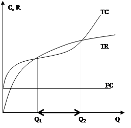 Г-н Липсиц просил студентов запомнить две важные вещи. Во-первых, что TR – это sales или, по крайней мере, выручка от продаж, и называть его принято среди воротил бизнеса именно так, а если кто скажет (при них) ”total revenue”, то его просто не поймут, ибо revenue – это доход, а на их языке доход – это прибыль. График издержек производства в точке, соответствующей Q2, делает резкий подъем, что связано с двумя независимыми процессами. С одной стороны, это объясняется крутизной подъема фиксированных издержек (это следует из концепции маржинальных издержек), а, с другой стороны, с этого момента приходит насыщение рынка. Во-вторых, необходимо отметить, что хотя на графике получается две точки пересечения кривых TR и TC, ВЕР’ом является только первая точка (та, которой соответствует объем продаж Q1). Двухсторонней жирной стрелочкой на графике обозначен запас финансовой прочности проекта, то есть то количество продукции, которое будет приносит прибыль. Этот график можно строить исходя из того, что откладываемые по оси абсцисс количества – это либо весь объем производства продукции, либо годовой масштаб производства. Смысл запаса финансовой прочности состоит в том, что по сути он показывает нам степень рискованности нашего проекта. Если он составляет 5-10% от ВЕР, то мы очень сильно рискуем, так как стоит нам чуть-чуть ошибиться в расчетах или капельку изменится экономическая ситуация, как мы очень серьезно пролетим.