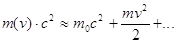 представляет собой релятивистское выражение для энергии тела, связанной с его движением. Однико, даже в случае нулевой скорости, согласно (13) лубое толо обладает энергией покоя, пропорциональной его массе. Эта колоссальная (по сравненью с характерными для классической теории масштабами) энергия до создания теории относительности оставалось “незамеченной” из-за того, что в подавляющем большинстве процессов суммарная масса составляющих систему объектов остается практически неизменной. Открытие энергии покоя имело громадное значение для развития энергетики и военной техники.