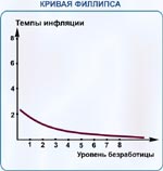 Согласно кривой, безработица высока, когда инфляция незначительна, и она снижается при возрастании инфляции. Кривая Филлипса предполагает возможность сокращения безработицы в условиях инфляции. И наоборот, повышение уровня безработицы (или изменение ее доли в рабочей силе) может сбить темпы инфляции, то есть подавить рост цен, а также достичь отрицательной инфляции (снижения цен), называемой дефляцией.