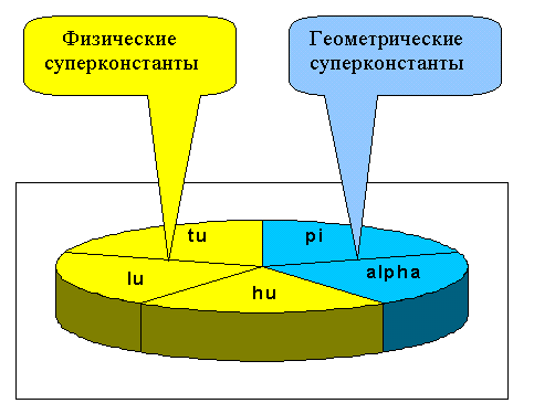 Размерные суперконстанты hu, lu, tu определяют физические свойства вакуума и являются константами фундаментального состояния материи (3 - 8). Суперконстанты π и α определяют геометрические свойства пространства-времени. Суммой геомет рических(π , α) и физических(hu, lu, tu ) супер констант представлен онтологический базис фундаментальных физических констант (Рис.1).