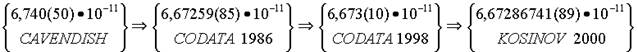 | Kosinov, 2000 | G = lu4107/e2tu2Do | 6,6728674(13)• 10-11m3kg-1 s-2 |
