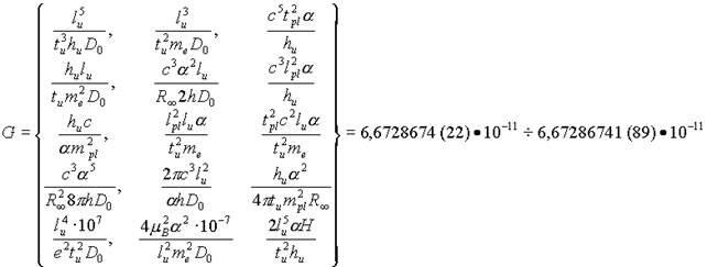 | Kosinov, 2000 | G = 4μB2α2·10-7/lu2 me2Do | 6,6728674(22)• 10-11m3kg-1 s-2 |