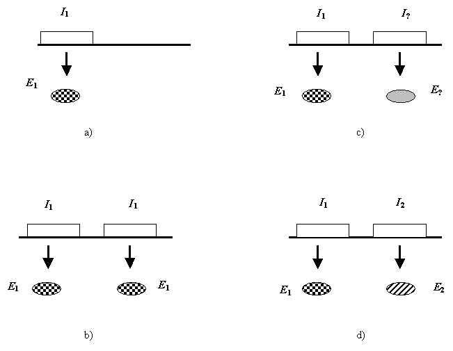 Рис. 1. Иллюстрация к механизму прогрессивной эволюции в теории нейтральности. Схема появления нового биологически значимого белка. Показаны участки ДНК ( Ii ) и кодируемые ими белки ( Ei ). a) ген I1кодирует белок E1, b) дупликация гена I1, новый участок (справа) кодирует тот же белок E1, c) случайный дрейф правого участка, d) возникновение нового биологически значимого белка E2кодируемого участком ДНК I2.