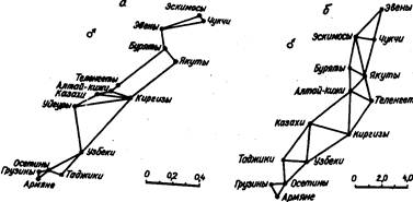 Рис. 3. Взаиморасположение казахов среди некоторых народов Евразии по сумме измерительных (а) и описательных (б) признаков головы и лицевого отдела.