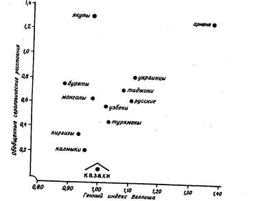 Поданным системы резус-фактора среди казахов исключительно преобладают лица с резус-положительной реакцией над резус-отрицательной. Для них характерно относительно высокое содержание аллеля D. На всей изученной территории показателя встречаемости резус отрицательности стабильны, так как изменчивость генных частот по данному локусу у казахов невелика, и они представляют собой однородную естественноисторическую общность. В масштабе общей казахской популяции уровень концентрации гена d не достигает распространенности этого аллеля у населения Восточной Европы, но она несколько больше, чем у жителей Центральной Азии. В общем по данному генетическому маркеру результаты определенно свидетельствуют о смешанном происхождении казахов между европеоидами и монголоидами. Здесь в качестве краткой иллюстрации можно привести процентное содержание резус-отрицательного фактора у народов Евразии. Правда, при этом проценты предварительно переводятся в баллы. С учетом полярности генетической структуры сравнительных популяций казахи стоят на четыре балла дальше от современных монголов, на пять баллов — от коренных народов Средней Азии и на десять баллов от восточных славян. Обобщенные генетические величины по изученным локусам позволяют заключить, что на попу-ляционном уровне у казахов вполне реально существует свой генофонд. Его специфическая особенность наиболее ярко проявляется при межэтнических сопоставлениях, где в серологическом отношении наиболее типичные представители как европеоидного, так и монголоидного расовых типов существенно отличаются от обобщенного генетического показателя у казахов (рис. 4). Таким обоазом-