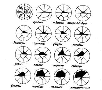 Как известно, специфическое сочетание полиморфных признаков кожного рельефа пальцев и ладони обладают высокой таксономической ценностью. Эти дерматоглифические данные по современным этническим группам сейчас широко используются в антропологической науке. В полученных материалах весь комплекс признаков дерматоглифики свидетельствует об однородности локальных групп казахов и ее гомогенности как популяций в целом. По основным свойствам кожных узоров казахи находятся на стыке монголоидно-европеоидных групп", т. е. относятся к популяциям метисного происхождения (рис.5).