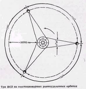 Существенное преимущество ССС со спутниками на геостационарных орбитах состоит в том, что при их использовании снижаются требования к наземным системам слежения и связи, при этом упрощаются или устраняются и устройства наведения бортовых антенн. помощью трех таких спутников, расположенных друг относительно друга под углами 120°, можно создать глобальную систему связи, т. е. систему, практически охватывающую всю Землю.