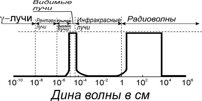 Взгляните на рисунок 1. Он иллюстрирует прозрачность земной атмосферы для электромагнитных волн различных длин. Гладкая горизонтальная часть кривой, совпадающая с горизонтальной осью графика, отмечает те излучения, для которых земная атмосфера совершенно не прозрачна. Два «горба» кривой, один узкий, другой широкий, соответствуют двум «окнам прозрачности» в земной атмосфере.