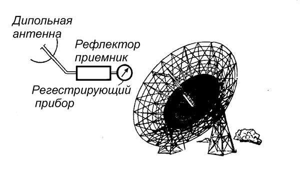 Зеркало концентрирует радиоволны на маленькой дипольной антенне, облучая ее. Вот почему эта антенна в радиотелескопах получила название облучателя.