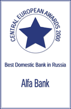 Журнал Central European удостоил Альфа-банк звания «Лучший банк России 2000 года» во многом благодаря тому обстоятельству, что банку удалось увеличить свой основной капитал с 50 млн долл. (на конец 1998 года) до 200 млн долл. (на конец 1999 года). В июне 2000 г. Euromoney назвал Альфа-Банк «Банком, наиболее заслуживающим доверия». |