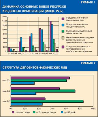 На протяжении 2003 г. доля вкладов «до востребования» уменьшилась с 18,1% до 16,9%, тогда как удельный вес срочных депозитов и иных привлечённых средств физических лиц сроком свыше одного года поднялся с 35,3% до 42,6%. Для сравнения отметим, что по состоянию на 1.07.1998 г. этот показатель составлял только 6,7%.