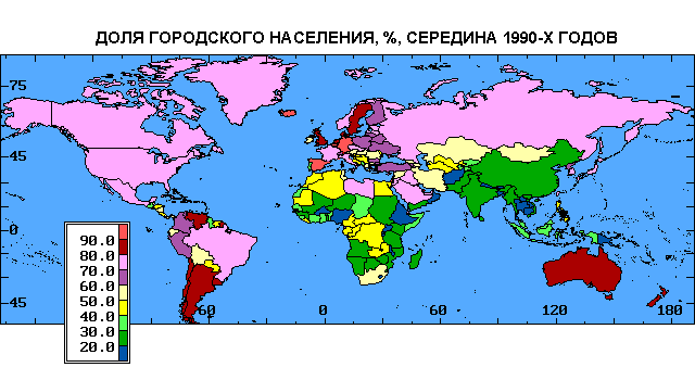 В нач. 19 в. в городах мира проживало 29,3 млн. человек (3% населения Земли), к 1900 — 224,4 млн. (13,6%), к 1950 — 729 млн. (28,8%), к 1980 — 1821 млн. (41,1%), к 1990 -2261 млн. (41%). Городское население Российской Федерации к нач. 1990 составляло ок. 74%. Доля городского населения (1990, %): в Европе 73, в Азии 31, Африке 32, Сев. Америке 75, Латинской Америке 72, в Австралии и Океании 71; в экономически развитых странах мира (1990, %): США 75, Германия 78,3, Великобритания 89.
