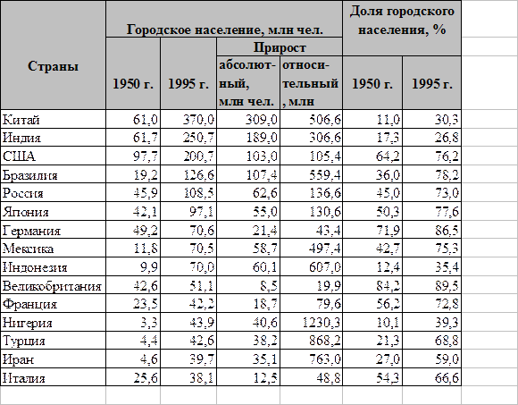 Сказанное в первую очередь относится к странам с низкой в недавнем прошлом долей городского населения и с наиболее высокими темпами прироста численности горожан в 1950-1990 гг., такими как Нигерия (её столица Лагос за этот период выросла почти в 27 раз и, по прогнозам демографов ООН, к 2000 г. выйдет на 8-е место среди агломераций мира), Турция или Иран, а также к странам, обладающим наибольшей «городской массой» с высокими темпами её прироста в этот период – Китай, Индия, Россия, Бразилия, Мексика, Индонезия.