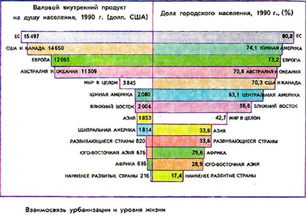 Важная особенность мировой урбанизации последних десятилетий - выход на авансцену развивающихся стран. В 1994 г. в них проживало уже 65,5% всех горожан мира (в 1950 г. – только 40,1%), а к 2025 г., по прогнозам демографов ООН, этот показатель возрастет почти до 80%.