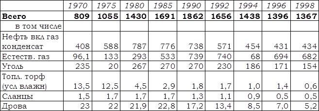 В 1994 г. общее производство первичной энергии в России составило 1410 млн. т. условного топлива. Доля газа, как самого дешёвого топлива, в последние годы быстро росла (за счёт сокращения добычи нефти и угля).