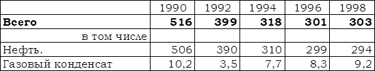Без сомнения, эти выводы, сделанные на основе взаимоотношений в ведущем районе, можно распространить и на всю систему нефтедобычи в целом, что даст определенное объяснение сложной ситуации в данной отрасли. Для нефтяной промышленности Тюмени характерно снижение объемов добычи. Достигнув максимума в 1988 году 415.1 млн. тонн, к 1990 году нефтедобыча снизилась до 358,4 млн. тонн, то есть на 13.7 процента, причем тенденция падения добычи сохраняется и в 1994 году.(10)