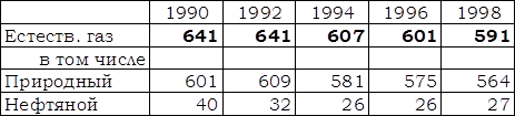 На фоне всеобщего спада производства газовая отрасль выглядит относительно благополучно. В 1993 г. было добыто 618 млрд.м3. газа (97% от уровня 1992 г. и 100% по отношению к 1989 г.). Некоторое снижение добычи в основном было связано с уменьшением спроса на этот вид топлива, поскольку сократились его поставки в страны ближнего зарубежья из-за постоянных неплатежей. Вследствие большого недостатка средств в отрасли резко сократились строительство и ввод в действие новых мощностей. За год было введено всего два новых месторождения – Комсомольское и Юбилейное.