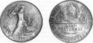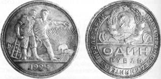 На первых монетах, выпущенных в 20-е гг., изображались люди труда: кузнец за работой, крестьянин – сеятель или же рабочий, который, приобняв крестьянина за плечо, указывает ему путь в светлое будущее. Сравнительно недолго центральное место занимала пятиконечная звезда. Постепенно все прочие изображения с советских монет вытеснил государственный герб – серп и молот на фоне земного шара в обрамлении колосьев и флагов с надписью: «Пролетарии всех стран, соединяйтесь!». На протяжении многих десятилетий, до распада Советского Союза, он неизменно представлял Страну Советов на монетах. Менялось лишь количество флагов (в соответствии с количеством союзных республик).