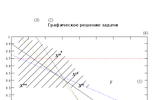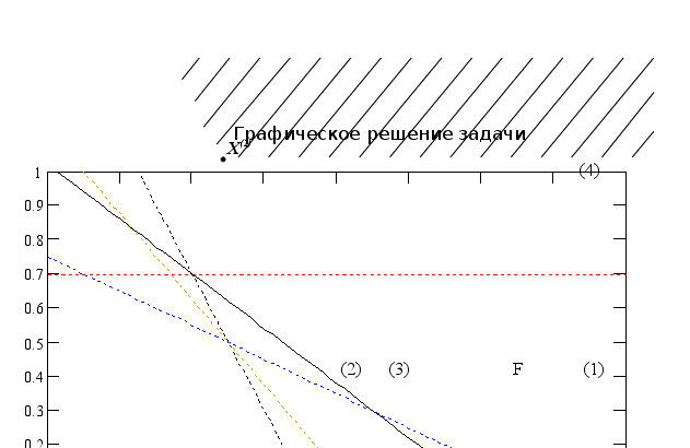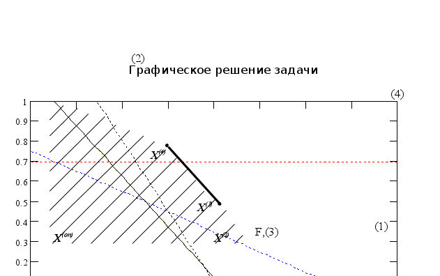 На графике видно, что оптимальное решение достигается на отрезке, значит является альтернативным. Вектор градиента целевой функции (F) параллелен радиус-вектору ограничения (3). Это ограничение образует все множество оптимальных решений.