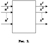Управляемый объект, о котором только что шла речь, в теории автоматического управления принято изображать так, как это показано на рис. 2. Величины u1,u2,…,ur (управляющие параметры) часто называют также «входными переменными», а величины x1, x2,…,xn (фазовые координаты) – «выходными переменными». Говорят ещё, что «на вход» объекта поданы величины u1,u2,…,ur, а «на выходе» мы получаем величины x1, x2,…,xn. Разумеется, на рис. 2 показано лишь условное обозначение управляемого объекта и никак не отражено его «внутреннее устройство», знание которого необходимо, чтобы выяснить, каким образом, зная управляющие функции u1(t),u2(t),…,ur(t), можно вычислить изменение фазовых координат x1(t),x2(t),…,xn(t).