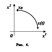 Как сказано выше, чтобы полностью задать движение объекта, надо задать его фазовое состояние x0=(x01, x02,…, x0n) в начальный момент времени t0 и выбрать управляющие функции u1(t), u2(t),…, ur(t) (для t>t0), т. е. выбрать векторную функцию u(t)= u1(t),u2(t),…,ur(t)). Эту функцию u(t) мы будем называть управлением. Задание начального фазового состояния x0и управления u(t) однозначно определяет дальнейшее движение объекта. Это движение заключается в том, что фазовая точка x(t)=(x1(t),x2(t),…,xn(t)), изображающая состояние объекта, с течением времени перемещается, описывая в фазовом пространстве некоторую линию, называемую фазовой траекторией рассматриваемого движение объекта (случай n=2 изображён на рис. 4). Очевидно, что эта линия исходит из точки x0, поскольку x(t0)=x0.