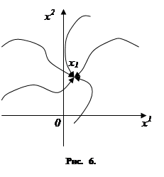 2. Задача управления. Часто встречается следующая задача, связанная с управляемыми объектами. В начальный момент времени t0объект находится в фазовом состоянии x0; требуется выбрать такое управление u(t), которое переведёт объект в заранее заданное конечное фазовое состояние x1 (отличное от x0; рис. 5). При этом нередко бывает, что начальное состояние x0заранее не известно. Рассмотрим один из наиболее типичных примеров. Объект должен устойчиво работать в некотором режиме (т. е. находиться в некотором фазовом состоянии x1). В результате тех или иных причин (например, под воздействием неожиданного толчка) объект может выйти из рабочего состояния x1 и оказаться в некотором другом состоянии x0. При этом точка x0, в которую может попасть объект, заранее не известна, и мы должны уметь так управлять объектом, чтобы из любой точки x0 (или хотя бы из точек x0 достаточно близких к x1) вернуть его в рабочее состояние x1 (рис. 6).