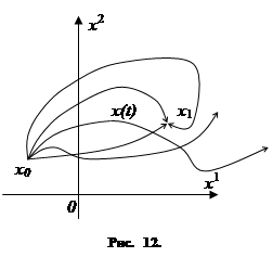 Предположим, что, зная начальное фазовое состояние x0и управление u(t)=(u1(t),…, ur(t)), мы определили фазовую траекторию x(t) (с помощью системы (1.4)). Если мы изменим управление u(t) (сохранив то же начальное состояние x0), то получим некоторую другую траекторию, исходящую из той же точки x0; вновь изменим управлениеu(t) – получим ещё одну траекторию и т. д. Таким образом, рассматривая различные управления u(t), мы получим много траекторий, исходящих из точки x0 (рис. 12). (Разумеется, это не противоречит теореме единственности в теории дифференциальных уравнений, так как, заменяя функции u1(t),…,ur(t) другими функциями, мы переходим от системы дифференциальных уравнений относительно фазовых координат x1,…, xn.)