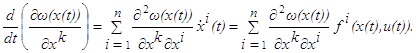 Пусть теперь (u(t), x(t)) ─ оптимальный процесс, переводящий объект из фазового состояния x0 в состояние x1, и t0≤t≤t1 ─ отрезок времени, в течение которого это оптимальное движение происходит, так что x(t0)=x0, x(t1)=x1 и t1=t0 + T(x0). Движение по рассматриваемой оптимальной траектории от точки x0 до точки x(t) осуществляется в течение времени t ─t0, а движение от точки x(t) до точкиx1 ─ в течение времени T(x0) ─ (t ─t0). Быстрее, чем за время T(x0) ─ (t ─t0), из точки x(t) попасть в точку x1 невозможно. Итак, T(x0) ─ (t ─t0) есть время оптимального движения из точки x(t) в точку x1, т. е. T(x(t))=T(x0) ─ (t ─t0). Заменив здесь T через ω, т. е. ω(x(t))=ω(x0) + t ─t0) и взяв производную по t, получаем