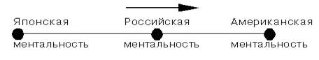 От Азии Россия впитала форму группового мышления – группизм, а от Европы – индивидуализм с присущим ему мировоззрением. Группизм и индивидуализм – два фундаментальных качества, составляющие основу русского менталитета. Причем они входят в противоречие между собой в силу полярности их основ. Их соотношение в ходе исторического развития не было постоянным. В дореволюционные времена общинные традиции были определяющими. В ходе столыпинских реформ произошел скачок в развитии индивидуализма. После революции 1917г. тенденция развития коллективизма вновь стала определяющей в динамике ментальности. В таких условиях индивид мог паразитировать за счет коллектива, искать не тяжелую, но хорошо оплачиваемую работу, хитрить, изворачиваться, что было хорошо известно в советское время. Но борьба с ним оказалась безуспешной. Ментальность нельзя искоренить, ее можно лишь использовать в интересах личности, коллектива и общества. Наоборот, люди пропитанные духом коллективизма, верой в светлые идеалы, работали ради общества, ради коллектива. В итоге они оказывались жертвой развивающегося индивидуализма, их менталитет трансформировался. Человек, понявший бесполезность своих усилий, начинал лениться, превращался в “ винтик”. Подобная психология сформировалась в 60-е годы и нашла отражение в теории “ Х” Мак Грегора. Она оказалась особенно актуальной для нашей страны, где объектом управления стал работник безынициативный. Инициатива стала наказуема, а ее “ виновники” наталкивались на недоброжелательное к себе отношение, которое вызывалось самим фактом проявления несанкционированной свыше самостоятельности. Таким образом, и индивидуализм, и коллективизм приходили в противоречие с традициями командной экономики. Последняя явилась одной из важнейших причин неэффективности советской системы. В настоящее время дуализм русского менталитета, его противоречивость, перешли на качественно иной уровень. Наблюдается новая волна роста индивидуализма, с одной стороны, и стирания общинных традиций, с другой. Однако дуализм был и остается главной чертой отечественной ментальности. Это и дает возможность определить его место по отношению к американскому и японскому менталитету. Если считать американский индивидуализм и основанный на нем менеджмент одной крайней точкой, а японский, базирующийся на психологии группизма, другой, то Россия с её двойственностью должна занимать промежуточное между этими двумя точками положение. Причем надо учитывать, что русский менталитет выступает как динамичный, имеющий тенденцию к индивидуализации, пробивающей себе дорогу в условиях формирующегося рынка. Исходя из этого, мы считаем, что основная тенденция становления русского менталитета – постепенное и неуклонное движение к индивидуализму в сторону американизированной ментальности. Это и показано на рис. 1: