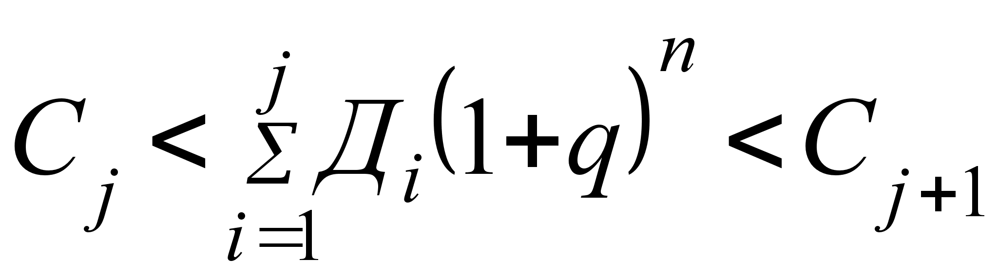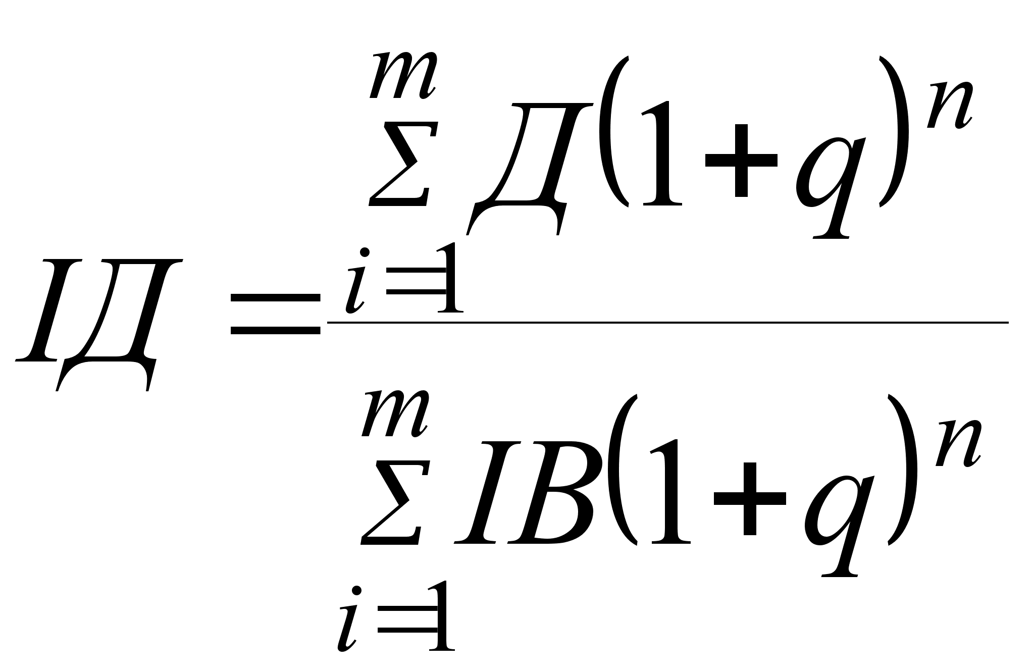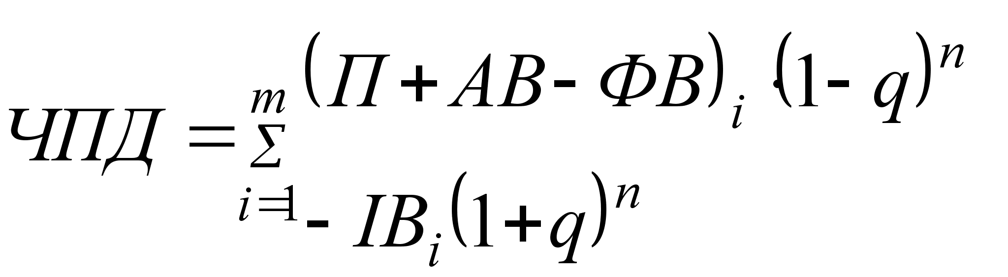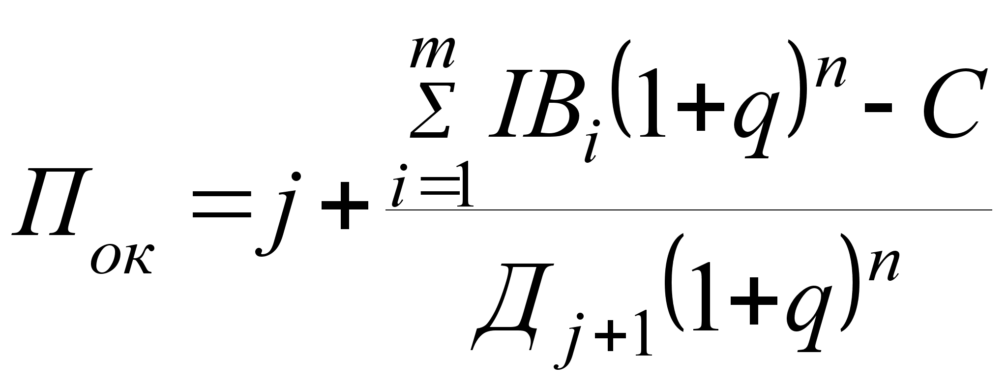 Визначається чистий приведений доход: де П — прибуток; АВ — амортизаційні відрахування; ФВ — фінансові витрати (відсоток за користування кредитом); ІВ — інвестиційні витрати; q — ставка дисконту або необхідна ставка доходу; i — порядковий номер року розрахункового доходу; m — розрахунковий період роки; — кількість років, що відокремлює витрати (результати) конкретного року від розрахункового. | Період окупності визначається підсумовуванням послідовних членів ряду доходів Ді, дисконтованих за ставкою q, поки не буде отримано суму, що дорівнює обсягу інвестицій. Підсумовуємо послідовні члени ряду доходів Ді, дисконтовані за ставкою q (суму позначимо через Сj), поки не буде знайдено суму, що дорівнює обсягу інвестицій: