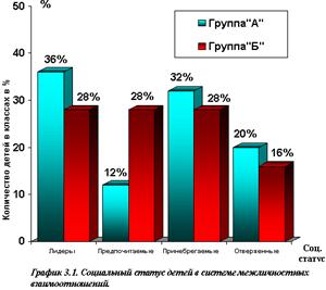 Выявлено, что "предпочитаемые" и "отверженные" подростки в классе отличаются разными системами ориентаций. "Предпочитаемые" в большей степени ориентированы на совместную деятельность. Когда они осознают угрозу утраты статуса, их стратегия поведения становиться активной и деятельность приобретает более интенсивный, целенаправленный, организованный характер. Ученики с неблагоприятным положением в классе фиксированы главным образом на взаимоотношениях со сверстниками. В случае угрозы их и без того неблагополучному положению в группе они аффективно реагируют на ситуацию и даже готовы вовсе разорвать отношения со сверстниками. Значимость эмоциональных связей в группах сверстников столь велика, что их нарушения, сопровождающиеся стойкими состояниями тревоги и психологического дискомфорта, могут оказаться причиной неврозов.