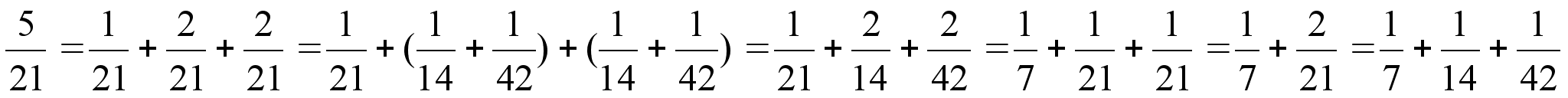 Но складывать такие дроби было неудобно. Ведь в оба слагаемых могут входить одинаковые доли, и тогда при сложении появится дробь вида 2/n. А таких дробей египтяне не допускали. Поэтому, папирус Ахмеса начинается с таблицы, в которой все дроби такого вида от 2/5 до 2/99 записаны в виде суммы долей. С помощью этой таблицы выполняли и деление чисел. Вот, например, как 5 делили на 21: