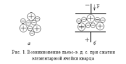 На рис. 1, а показана структура элементарной ячейки кварца, состоящей из 3х молекул диоксида кремния. При отсутствии деформации центр тяжести положительных и отрицательных ионов совпадает (плюсом отмечены ионы кремния, минусом – кислорода). Сжатие кристалла в вертикальном направлении (рис. 1, б) приводит к смещению положительных ионов вниз, а отрицательных вверх. Соответственно, на наружных электродах появляется разность потенциалов. Рассмотренное явление называют прямым пьезоэлектрическим эффектом. Существует и обратный пьезоэффект, когда под действием приложенного напряжения и в зависимости от его полярности пьезокристалл (кварц, сегнетова соль, турмалин и др.) поляризуется и изменяет свои геометрические размеры. Если же к пьезокристаллу приложить переменное напряжение, то в нем возбуждаются механические колебания определенной частоты, зависящей от размеров кристалла.