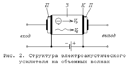 Одним из основных приборов акустоэлектроники является электроакустический усилитель (ЭАУ). На рис. 2 показана схема такого усилителя на объемных волнах. На торцах полупроводникового звукопровода (З) расположены пьезоэлектрические преобразователи (П), которые с помощью омических контактов (К) присоединены с одной стороны к звукопроводу, а с другой – к входным и выходным клеммам. При подаче на вход переменного напряжения во входном пьезопреобразователе возбуждается акустическая волна, которая распространяется по звукопроводу. Взаимодействие волны с движущимися в том же направлении по полупроводниковому звукопроводу электронами обеспечивает ее усиление. Рассмотрим это явление. Предположим, что в звукопровод вводится гармоническая продольная акустическая волна, движущаяся со скоростью Vв. Давление в кристалле при этом от точки к точке меняется. В тех местах, где кристалл сжимается, пьезо-э. д. с. замедляет движение электронов, а в тех местах, где растягивается, – ускоряет. В результате этого в начале каждого периода волны образуются сгустки электронов. При Vэ > Vв сгустки движутся в тормозящих участках волны и передают ей свою энергию, чем и обеспечивается усиление. Подобные акустоэлектронные усилители могут давать выходную мощность сигнала порядка нескольких ватт, имея полосу пропускания до 300 МГц. Их объем (в микроэлектронном исполнении) не превышает 1 см3.