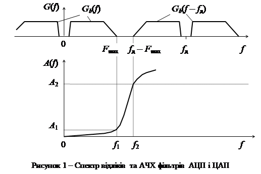На рис. 1 наведені: S (f) – спектр відліків, поданих вузькими імпульсами, Sb (f) – спектр неперервного сигналу(t), A(f) – робоче ослаблення ФНЧ. Для того, щоб ФНЧ не вносили лінійних спотворень у неперервний сигнал, гранична частота смуги пропускання ФНЧ повинна задовольняти умові
