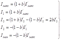 Для расчета коэффициента гармоник двухтактного каскада с несимметричными плечами токи I’макс, I’1, I’0, найденные по статическим характеристикам усилительного элемента, принимают за номинальные и находят пять значений токов Iмакс, I1, I0, I2 и Iмин, предположив, что одно плечо имеет токи в (1+), а другое в (1-), отличающиеся от номинальных. Учитывая, что токи второго плеча имеют обратное направление, их считают отрицательными. Остаточный ток покоя I0, вызывающий подмагничивание выходного трансформатора, равен разности токов покоя обоих плеч. В результате получим следующие формулы для вычисления указанных токов: