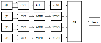 СУ1…4 – согласующие усилители, ФНЧ1…4 – фильтры нижних частот, УВХ1…4 – устройства выборки-хранения, MS – мультиплексор, АЦП – аналого-цифровой преобразователь.