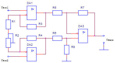 Для достижения наибольшего ослабления синфазной помехи коэффициент усиления первой ступени усиления на DA1, DA2 примем наибольшим, а коэффициент усиления разностного усилителя на DA3 примем равным единице. В этом случае резисторы R5¸R8 получаются одного номинала, что облегчает их подбор.