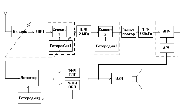2.1 Данное радиоприемное устройство построено по супергетеродинной схеме с двойным преобразованием частоты и имеет фильтры в тракте звуковой частоты. Эти фильтры предназначены для: ТЛГ – амплитудная телеграфия с полосой 100 Гц и ОБП – телефонный однополосный сигнал с подавленной несущей с полосой 3 кГц .