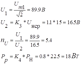1.6Расчёт действующих значений напряжений на первичной U1 и вторичной U2 обмотках трансформатора, коэффициента трансформации по напряжению nU,потребляемой мощности трансформатора Pp.