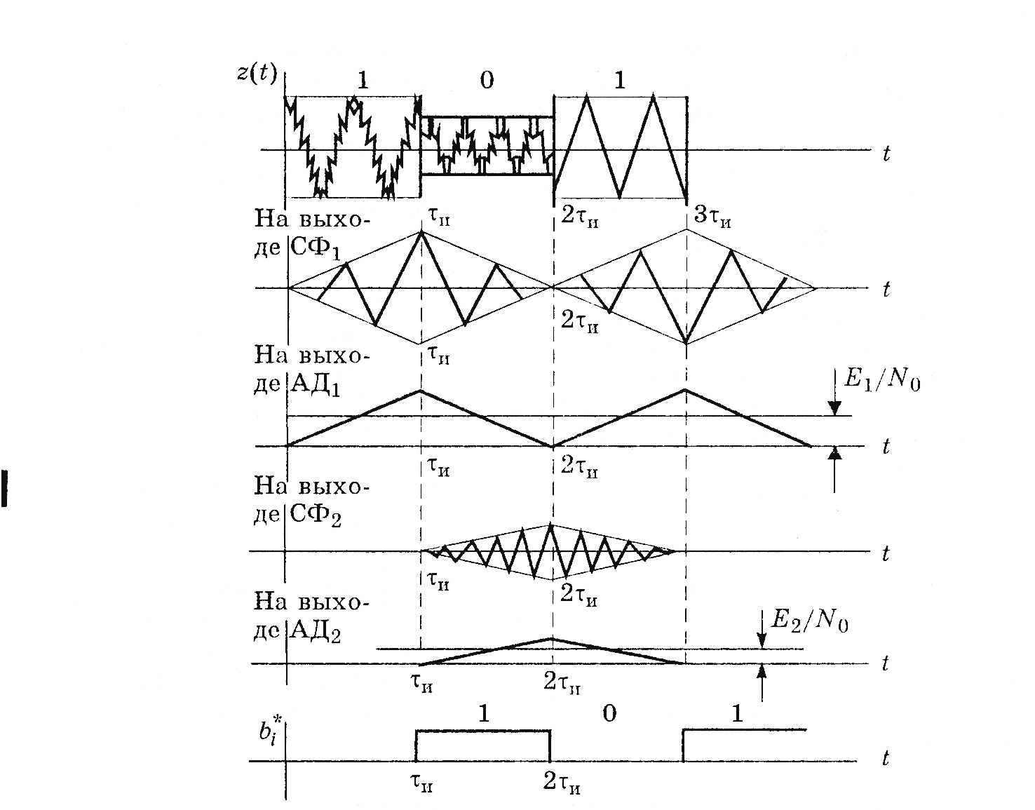 Смесь сигнала и шума Z(t) фильтруется согласованным фильтром, а затем выделяется огибающая сигнала на выходе этого фильтра. Огибающая сравнивается с пороговым уровнем, величина которого при равных априорных вероятностях P(U1(t)=P(U2(t) определяется соотношением Ei/No. Если эти вероятности не равны, пороговый уровень изменится на lnP(U1(t)/P(U2(t). При превышении порогового уровня в верхнем канале принимается решение bi*=1, а если в нижнем, то bi*=0. Временные диаграммы поясняющие работу оптимального демодулятора ЧМ сигнала приведены на рис.7