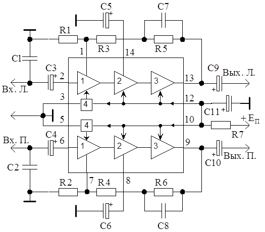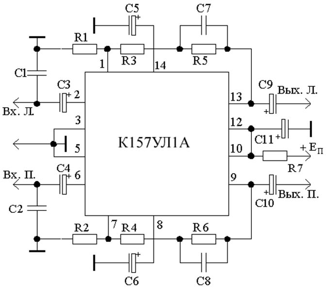 Уменьшение собственных шумов микросхемы достигнуто применением режима микротоков во входном и оконечном усилителях и большими коэффициентами усиления.