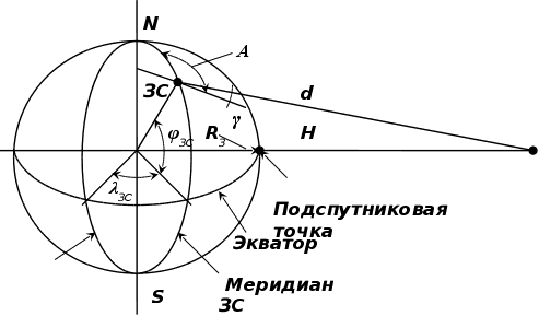 и азимут А. При этом необходимо допустить, что Земля является неидеальным шаром, а возвышение земной станции над уровнем моря нулевое. Тогда угол места