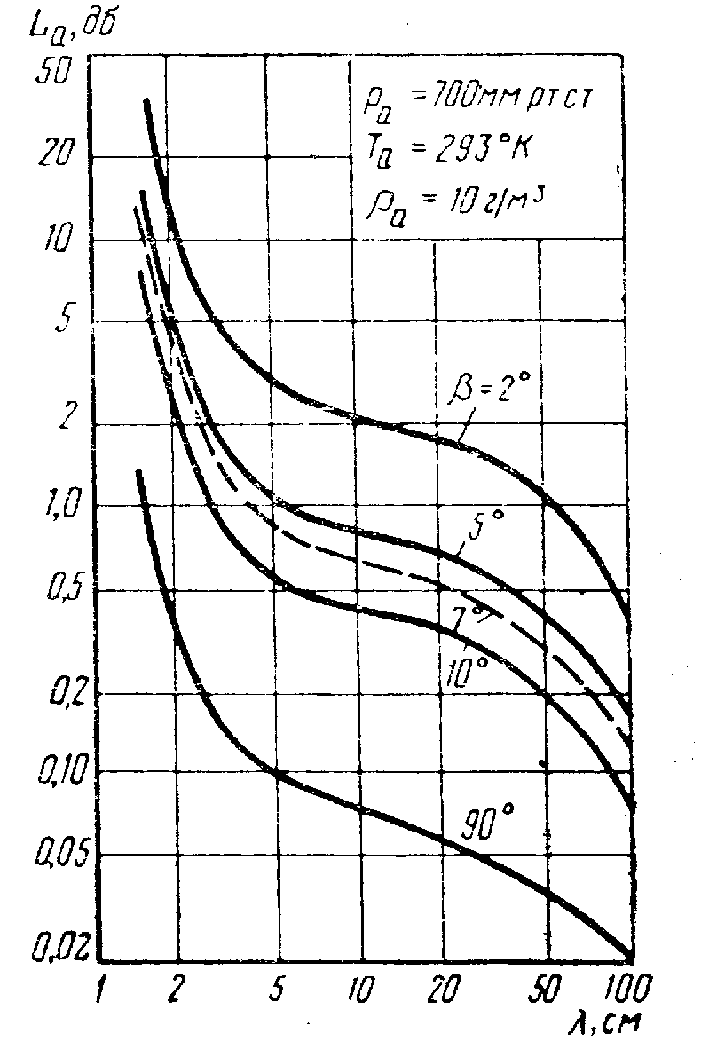 – потери в спокойной атмосфере, определяющиеся поглощением энергии ЭМВ в молекулярном кислороде и водяных парах тропосферы. Эти потери увеличиваются с уменьшением угла места, так как при малых углах места радиоволны проходят через большую толщу атмосферы.