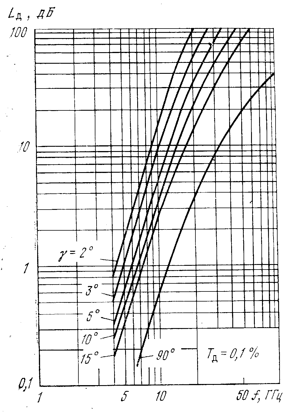Рис. 1.2. Зависимость поглощения радиоволн в спокойной атмосфе- ре (без дождя) при различных уг- лах места | Рис. 1.3. Зависимость поглощения сигнала в дожде от частоты при раз- личных углах места |