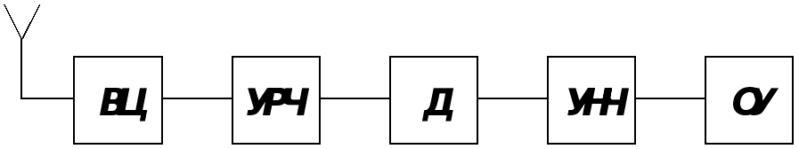 Структурная схема приёмника прямого усиления (рис. 2.3) включает входную цепь (ВЦ), усилитель радиочастоты (УРЧ), демодулятор (Д), усилитель низкой частоты (УНЧ) и оконечное устройство (ОУ).