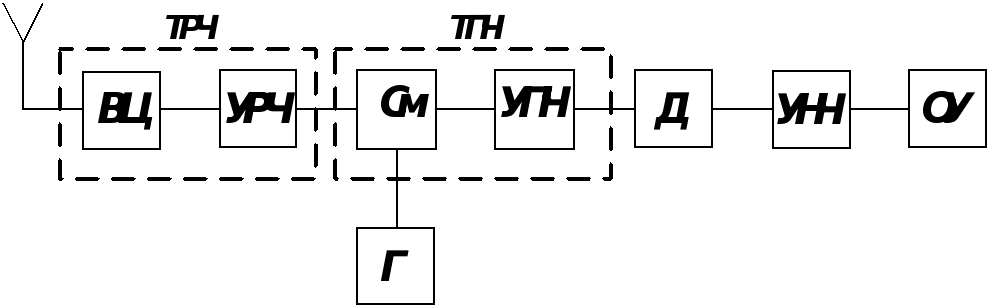 Структурная схема приёмника супергетеродинного типа включает тракт радиочастоты (ТРЧ) и дополнительно тракт промежуточной частоты (ТПЧ), состоящий из смесителя (СМ), усилителя промежуточной частоты (УПЧ) и гетеродина (Г), которые образуют общий тракт приёма (ОТП). В тракте ПЧ осуществляется перенос радиосигнала на постоянную и более низкую промежуточную частоту